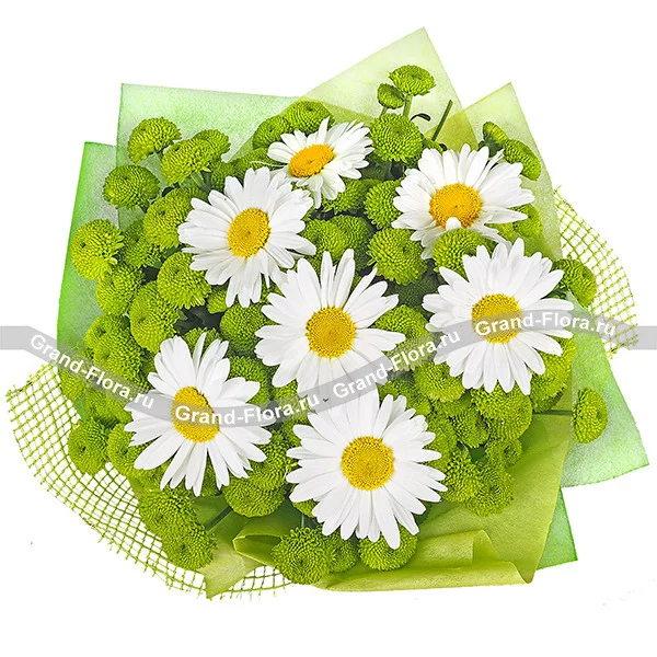 ЛЮКС: хризантема кустовая зеленая - 11 шт, ромашка белая - 12 шт, фетр зеленый, сетка зеленая.