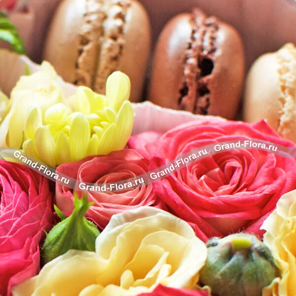 Стандартный (на фото): ранункулюс розовый - 1 шт., роза розовая - 5 шт., эустома кремовая - 1 шт., оазис, фетр розовый, макарунс - 3 шт., коробка в виде сердца (14х14 см), подарочный сертификат Летуаль.