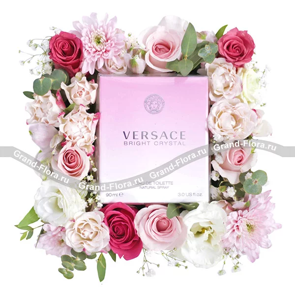 Стандартный: роза темно-розовая - 3 шт., роза светло-розовая - 4 шт., эустома белая - 1 шт., хризантема кустовая розовая - 1 шт., роза кустовая белая - 1 шт., эвкалипт - 1 шт., гипсофила., парфюм "Versace Bright Crystal 30 ml., оазис, коробка.